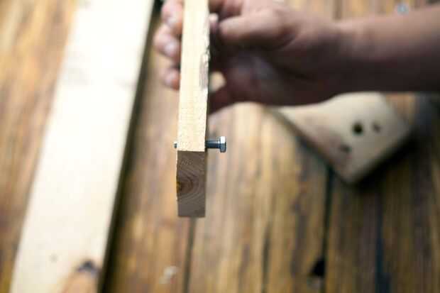 Lugar dos #10 x 1-1/2 pulgada los pernos a través de la Junta de 6 pulgadas. Enrosque los extremos del perno a través de los orificios en la lata y luego su mano en la lata para fijar las tuercas en los pernos de la materia.