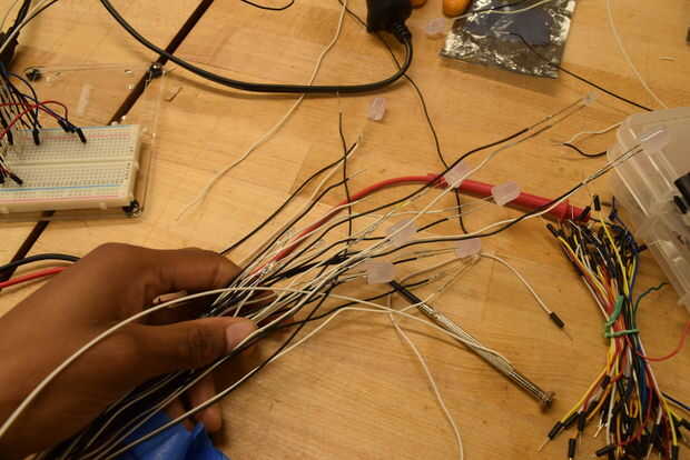 Siguiente paso fue soldar los cables de los LEDs. Corté los cables a varias longitudes, de corto y largo - para imitar los tentáculos de la medusa, que no son todos iguales.