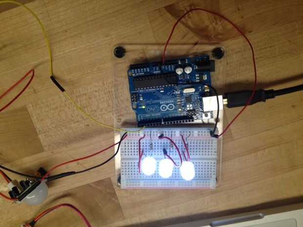 El sensor de PIR calibra a la temperatura del medio ambiente y luego detecta todos los cambios posteriores, dentro de un rango específico, es decir. Esto se traduce en detección de movimiento, técnicamente, aunque por definición, no es exactamente lo que ocurre. Activación del sensor PIR permite actual en el resto del circuito. En el siguiente bosquejo, LEDs se iluminan en la activación del sensor PIR. Este es un paso para probar si funciona el sensor PIR.