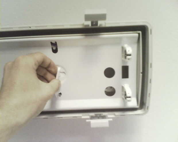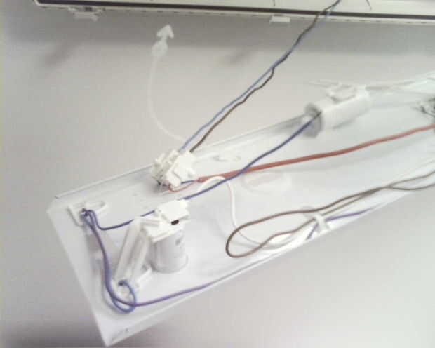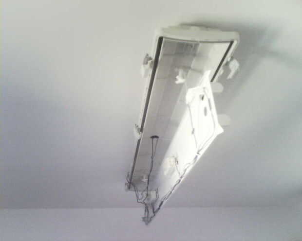 Más accesorios de este tipo tienen una bandeja metálica a la que todo está montado. En luminarias abiertas simplemente abrirlo y los componentes quedan dentro. A veces el accesorio sí mismo actúa como la bandeja y se monta directamente en el techo.