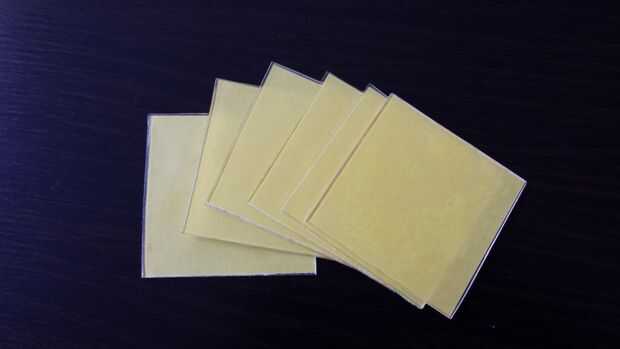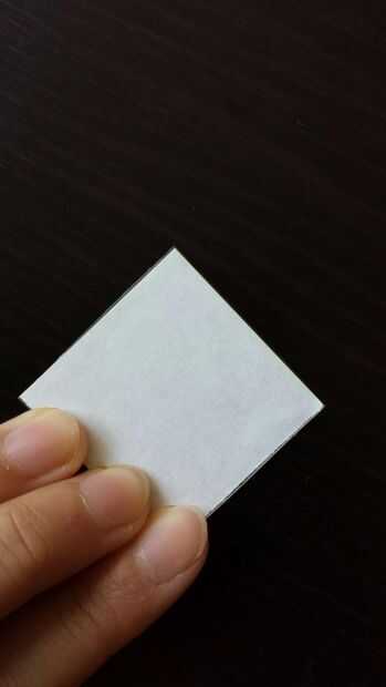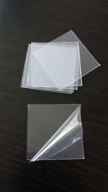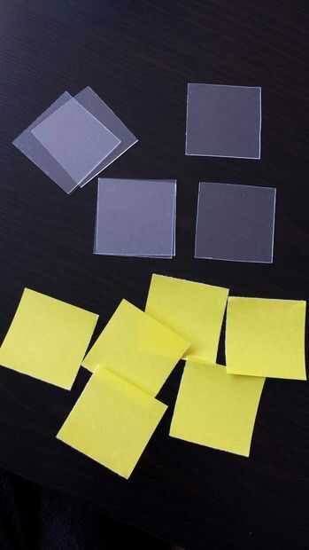 Me corte 1.5" por 1.5" cuadrados de poliester y quitado solamente un lado de la película de protección de la hoja. Asegúrese de utilizar unas tijeras afiladas. De lo contrario los bordes se ven un poco desiguales. He dejado al otro lado de la película sobre por lo que sería más fácil pegar el papel de origami.