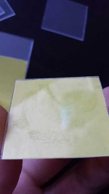 Pegue los cuadrados de papel de origami para el lado de la clara de poliéster con la película todavía en él. No use pegamento líquido de ningún tipo, ya dejará un residuo fangoso mirando contra el poliéster claro. En cambio, sólo frotar un palo de pegamento con moderación en la parte coloreada de su papel y presione contra el lado protector de poliester.