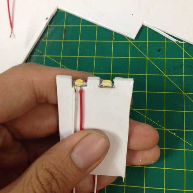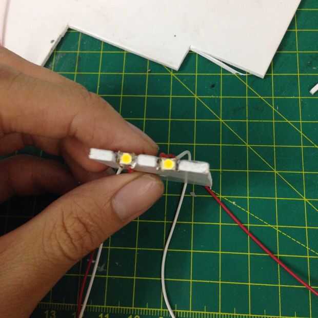 Corte un canal para los cables de LED pasar y luego pegar las piezas de tope. El LED y los cables deben ser planos a la superficie. Traté de usar algunas cintas para aislar los cables pero es demasiado abultada. Así que acabo de poner más pegamento para pegar el cable aparte