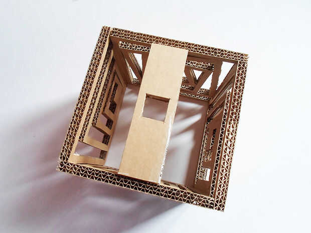 Coloque la pantalla boca abajo y pega el rectángulo de cartón en el interior del cubo, manteniéndolo cerca de la frontera superior. Asegúrese de centrar y presiona los dos lados opuestos del cubo para hacer que se pega a la pieza rectangular.