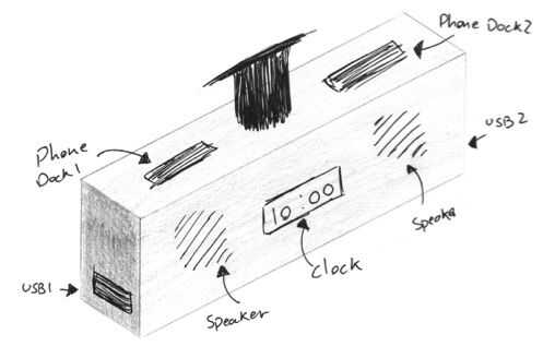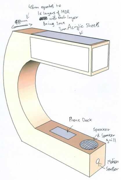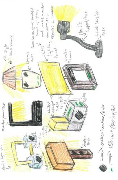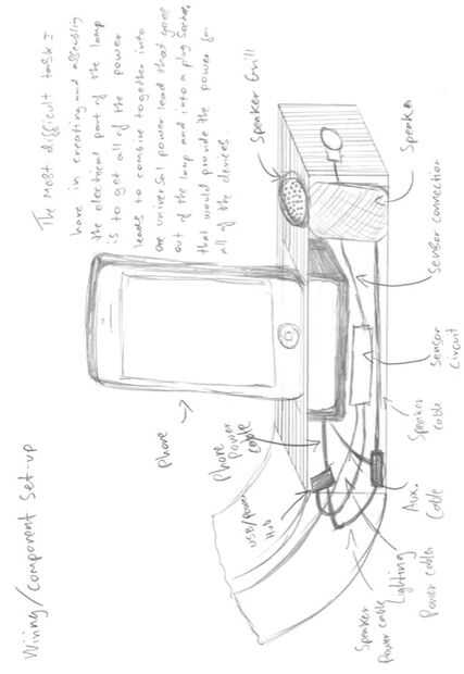 Quería la lámpara combinar tantas cosas como sea posible, por ejemplo obviamente tenía que ser una fuente de luz, quería que poder cargar el teléfono, tocar música y posiblemente con un reloj incorporado, sin embargo nunca consiguió alrededor a realmente hacerlo, que pensaba que era una vergüenza.