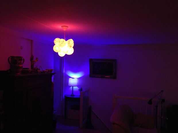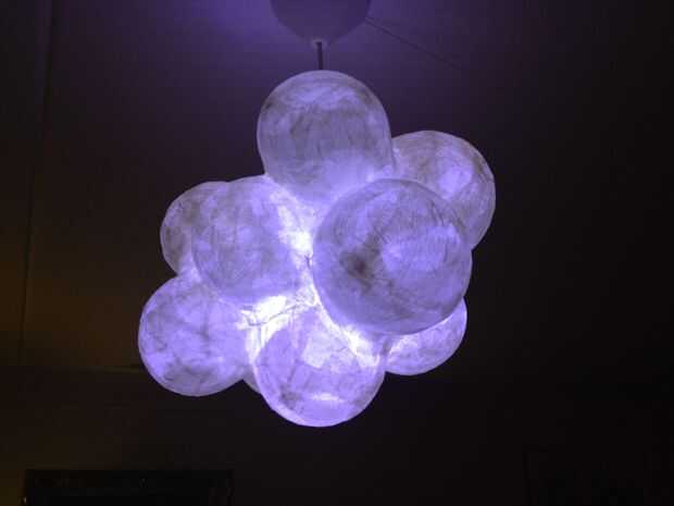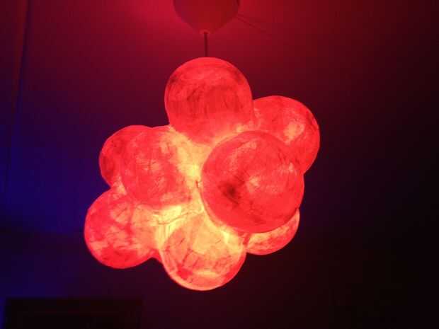 Se trata de una lámpara hecha de papel maché, pegado 12 globos. Los globos estaban pegados junto primero y luego frota con vaselina (para conseguir los globos fuera de la construcción, cuando se había endurecido el papel maché). En el mismo período de tiempo que hice la lámpara compré el sistema Philips Hue, con tres focos conectados a la red wifi local con un puente. Uno puede decidir qué color de los bulbos son dada y en qué brillo ajustando en un smartphone o tablet (en mi caso iPhone e iPad). Creo que el tono hace una buena combinación con la lámpara de mi nube.