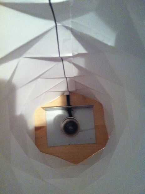 Mientras que hay una lata de spray adhesivo junto a la lámpara decidí no utilizarlo. Ya estoy haciendo una lámpara altamente inflamable, que no quería introducir la nueva fuente de combustible. Y carecer de cualquier tachuelas opté por usar una pequeña cantidad de pegamento en su lugar. También corté una pequeña abertura para el cable de alimentación. Si tu pregunta cómo la sombra está asegurado, justo ahora no es. Sentados allí, ocupándose de sus propios negocios.