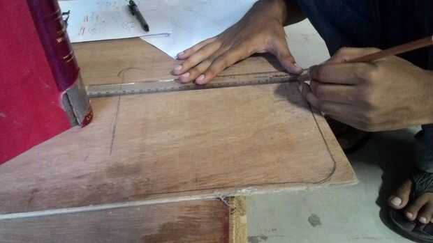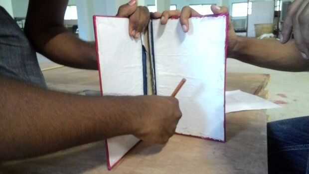 Luego se dibuja un esquema de la base del libro que se levantará con la hoja traslúcida para darle forma de libro. Debe tener cuidado ya que este paso es el más importante. Madera se debe cortar por el contorno que se hace y luego alisado usando la máquina o papel de lija