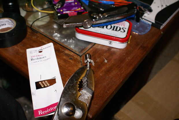 el conector RCA es solo potencia a los 9v pero no es necesario. Bueno, ojala los titulares de LED en su altoids pueden aquellos en los agujeros que ha perforado y asegúrese de que ajuste los LED luego palanca hacia atrás los lados en los soportes de y sacan el LED pero no conexión em todavía. vaya que algunos cables asegurarán de que sabe usted que es positivo y negativo en el LED, donde vivo el uno más largo es el positivo y el más corto es el negativo, luego enrolle los cables alrededor de los cables y soldarlos juntos y asegúrese de que no disponen un pequeño remolcador. utilizar la cinta aislante y envuelva cada uno llevar pero no todo el camino, dejan algunos de los conductores del LED en la parte superior que muestra. Para mi LED rojo necesitaba una resistencia de 330 ohmios para mi uno necesitaba un 100 ohm causan el blanco quería brillo máximo desde los 9v pero si utilizas 2 LED blanco luego conectaría en paralelo y el rojo como una sola, el LED rojo que estoy usando es una brillante estupendo así que solo me falta uno pero me quemo uno de mis LED im tan sólo con 2 pero si conectas los blancos en paralelo necesitas resistencias de 2. a continuación añadir que un interruptor con 3 conductores entre los tres cables positivos.