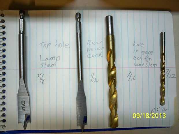 7/32 bits para taladro piloto un agujero en la parte superior de la base. 7/16 bit para que la lámpara fijar a la caja eléctrica (perforada en el cuadro) 5/8" bit a través de la madera en la parte superior de la base de la lámpara.