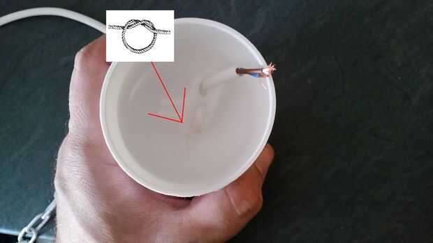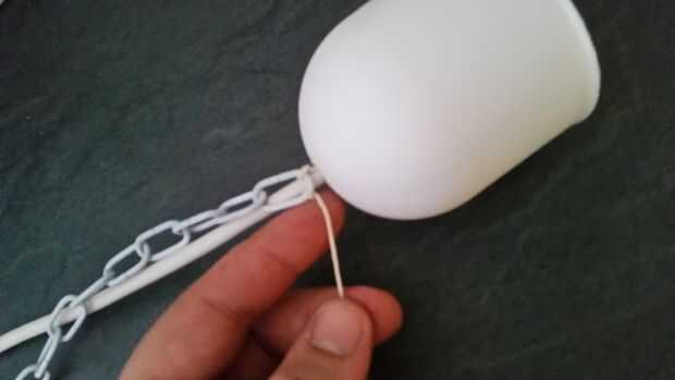 A continuación, usé el cable para detener el primer eslabón de la cadena (que debe estar retorcido a lo largo del cable a la lámpara).