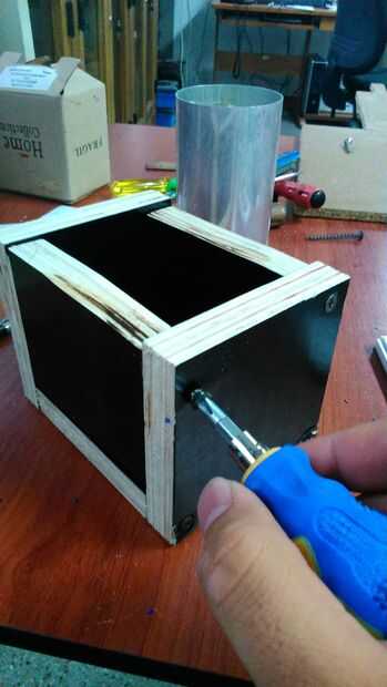 Porque yo tenía 3 potenciometros y un tablero de circuito es necesario un recipiente así que decidí hacerlo en madera, así que cortar 5 rodajas y ponerlos junto con los tornillos (1) (2)