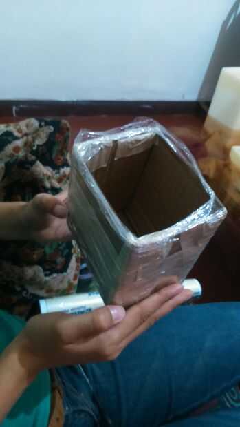 Para el molde que utilicé cartulina con las medidas de la caja fue 11,5 cm X 11,5 cm X 7,5 cm y corte una caja de tamaño por lo que puede caber a la derecha (3) después de cortar las otras partes (4) los pone con cinta.