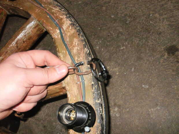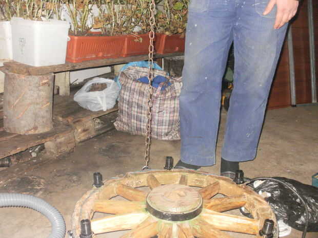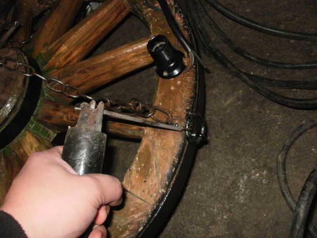 El refugio no que alta - unos 2,7 metros y tuve que hacer la araña para llegar a no más de 2 metros en la parte más baja. La rueda era unos 40 cantimeters amplia la distancia entre el techo y la rueda tenía que ser no más de 30 cantimeters. Con la cadena que había medido que necesito 29 piezas de cadena en las dos direcciones de colgar. Así que tenía que hacer alguna soldadura a. Corté dos trozos de cadena en ambos extremos por lo que yo puedo soldar junto con el tornillo.