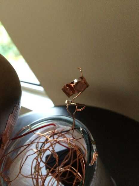 Utilizando cinta de cobre, añadir un imán al otro extremo del alambre de cobre positivo.