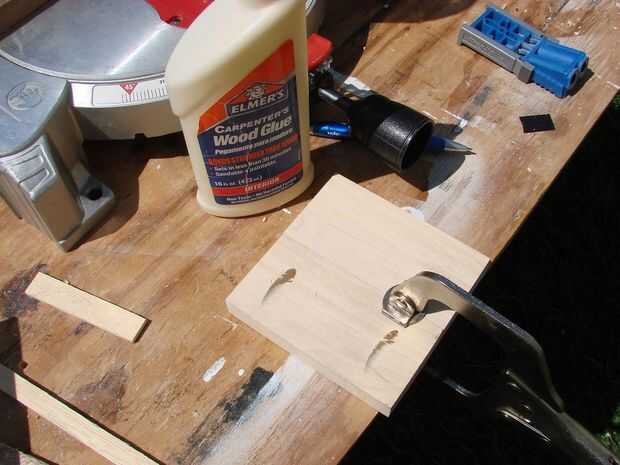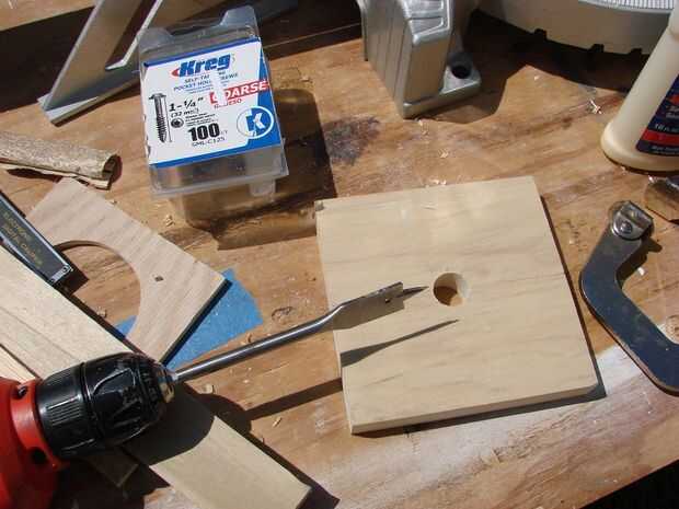 La base se construye de dos 5" largos trozos de madera de álamo de 2 1/2". Puede utilizar una pieza de contrachapado de 1/2" o 3/4" así. Usé un Kreg jig para crear dos agujeros de bolsillo por debajo de la base para atornillar las dos piezas. Sólo podría unir las piezas, sujetarlos y esperar a que el pegamento se seque. Cualquier método que utilice, una vez que las piezas se unen correctamente (en caso de cola dan el tiempo de cola para) usar la broca para cortar un orificio de 3/4" en la base para el tubo de acero inoxidable. Ajustar el orificio con papel de lija para conseguir un ajuste perfecto.