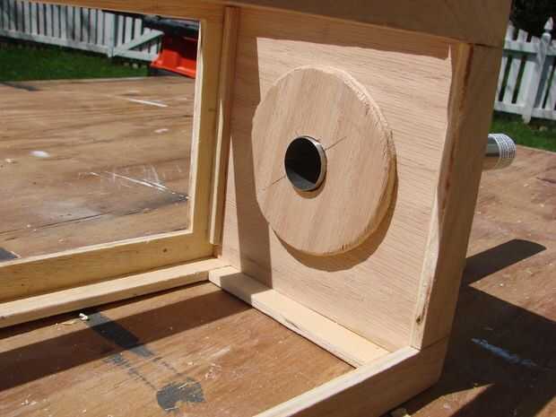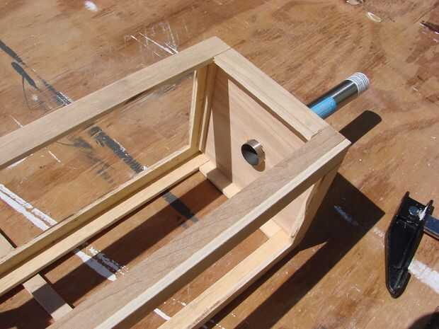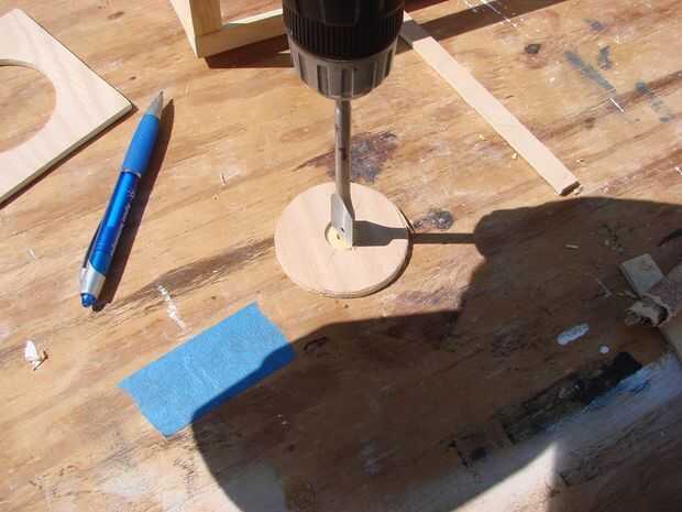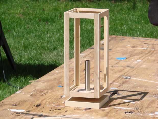 Trabajando cuidadosamente, hacer el agujero en el centro del panel base. Hubiera sido más fácil hacer este agujero antes de pegar todo pero este fue un cambio de diseño de último minuto. Utilice papel de lija envuelto alrededor de un pasador para ajustar las dimensiones hasta el tubo del acero inoxidable se ajusta perfectamente a través del orificio.