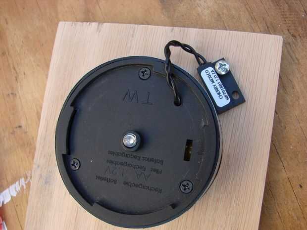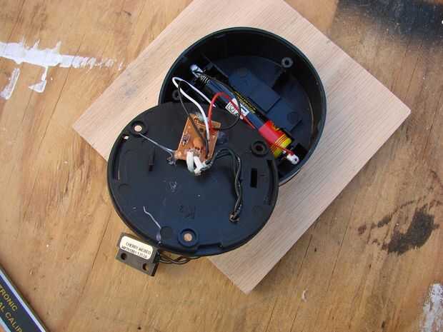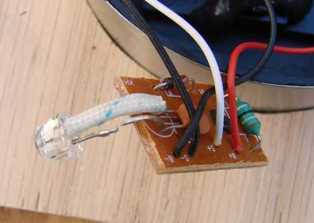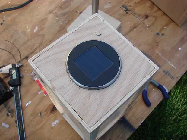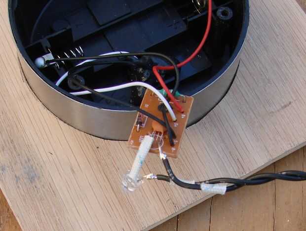 Retire la base del módulo solar y perfore un orificio de 1/8" para acceso de cables. Retire con cuidado la placa de circuito impreso de la base y luego se corta uno de los terminales del led aproximadamente en el centro. El relé es soldado a las dos piernas cortadas para que la ruta actual es de la batería, a través de la transmisión y luego el LED. Cuando se retira el imán, el relé está abierto y el LED permanece apagado. Poder de corte al LED asegura que el circuito de carga de la batería sigue siendo funcional.
