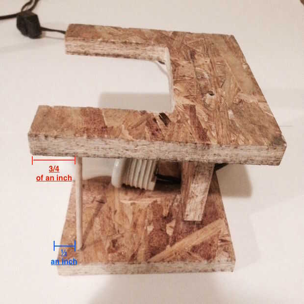 es importante colocar la bombilla con los dos trozos de madera para soporte de al menos un 1 ½ a 2 pulgadas de distancia de la columna lumbar para que la bombilla no calienta la madera