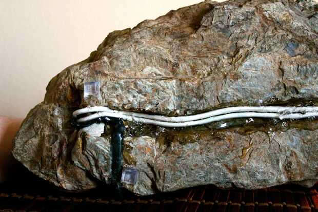 Para la parte inferior de la roca, no quiero rock a ver sierra hacia adelante y hacia atrás sobre la cuerda, para presentar una pista por la roca que el cable podría sentarse en. Lo hice con unos diamantes con punta de bits y una Dremel. Presentó a casi un cuarto de pulgada. Esta parte no es necesaria si usas a algún tipo de goma o corcho pegatinas para poner en la parte inferior. Sólo quería asegurarse de que los cables estaban al ras con la roca.