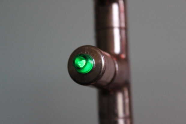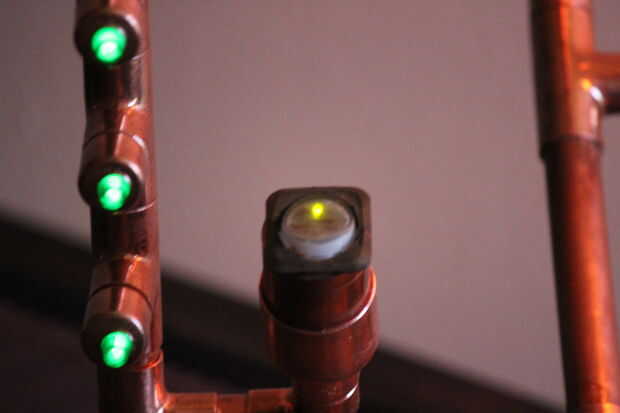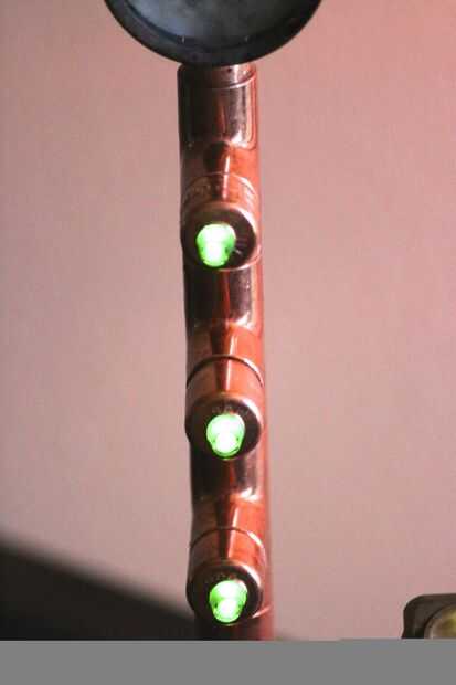 Compré la LED de shack de radio. Así que por suerte fueron creados para 120v, tuve que usar nada para reducir la electricidad. He perforado un agujero de 3/16 pulgadas en las cubiertas de cobre y montan los LEDs en ellos.