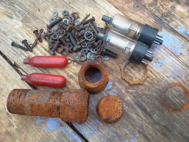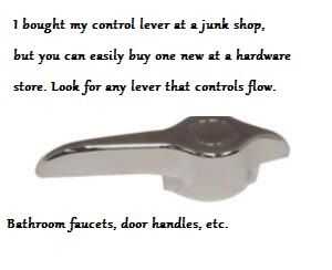 He utilizado CO2 cartuchos, viejos tornillos, tuercas y pernos, cable viejo, un viejo mango de control de flujo amarillo, una broca vieja y algunos latón cosa-a-ma-bobs, que tengo en la bolsa de desecho.