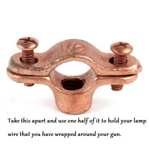 Envuelva el cable de la lámpara alrededor del arma y usa el colgador de tubería de arillo para sostener el cable de la lámpara alrededor del arma.