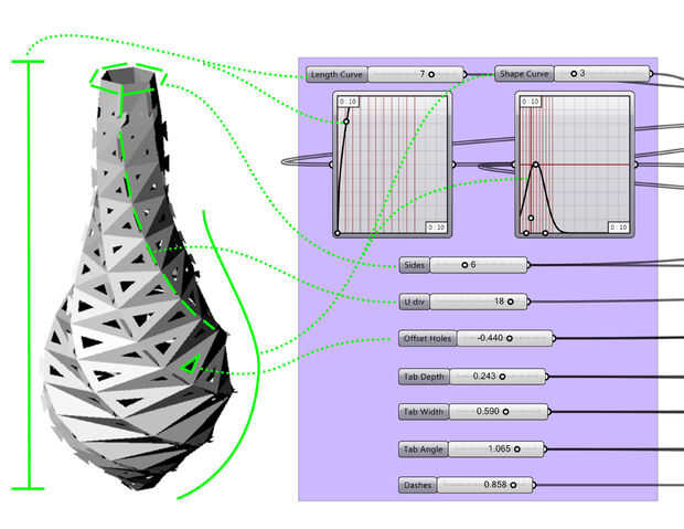 "Lados" cambia el número de tiras, "div U" cambia el número de subdivisiones o facetas y "agujeros Offset" cambia el tamaño de los agujeros triangulares en las facetas.