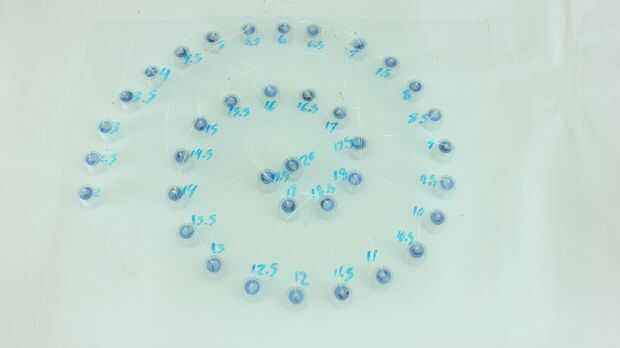 Mida la longitud designada para cada trozo de sedal y un nudo. Cuando termines, deben colgar las tapas en una espiral descendente.