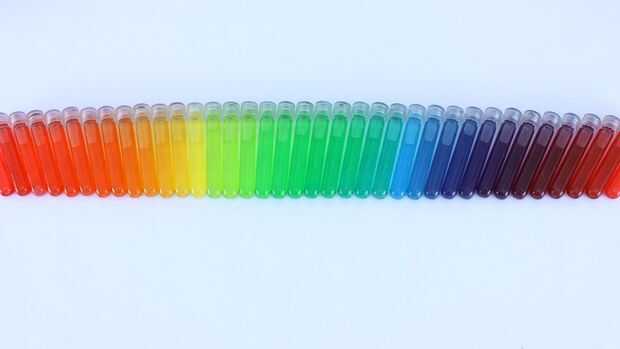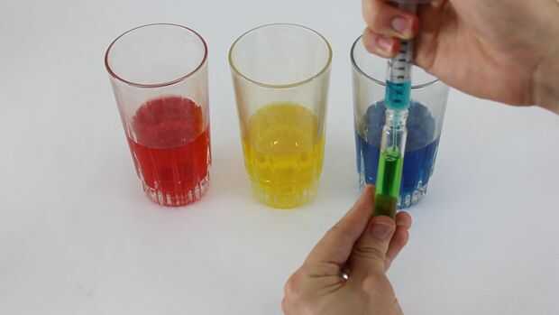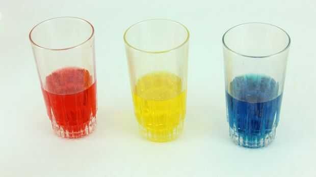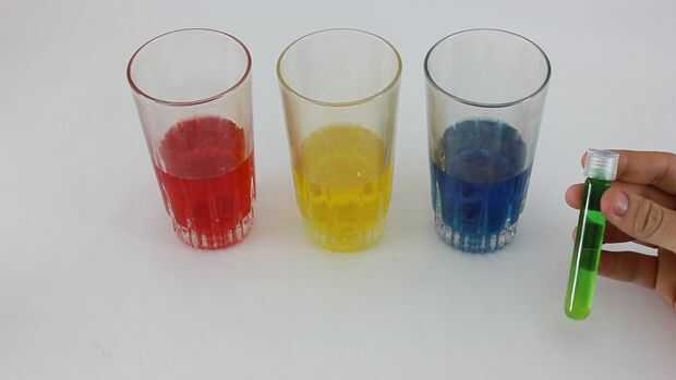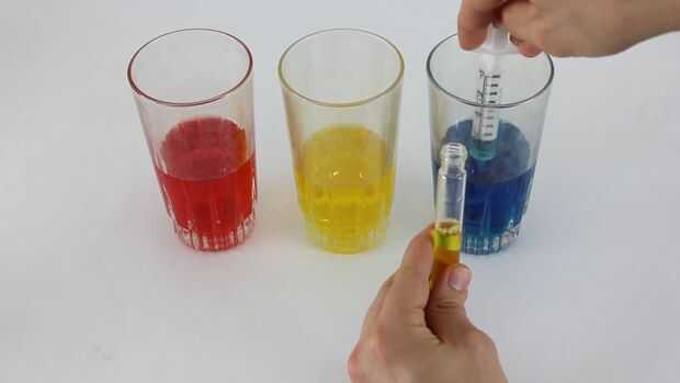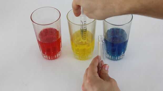 Luego necesitas mezclar los colores en cada uno de los tubos de ensayo. La forma más sencilla de hacerlo es mezclar tres vasos con colorante alimenticio rojo, amarillo y azul. Luego se mezclan los colores en las proporciones adecuadas para crear su patrón del color elegido. Esto es más fácil hacerlo con un gotero de medicina pequeña.