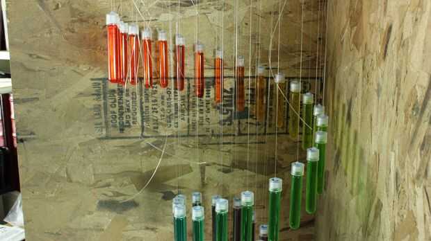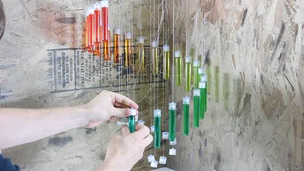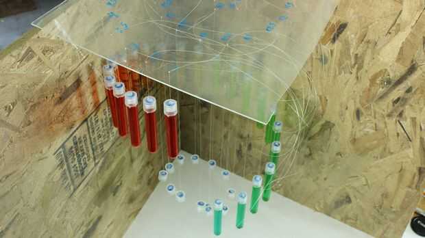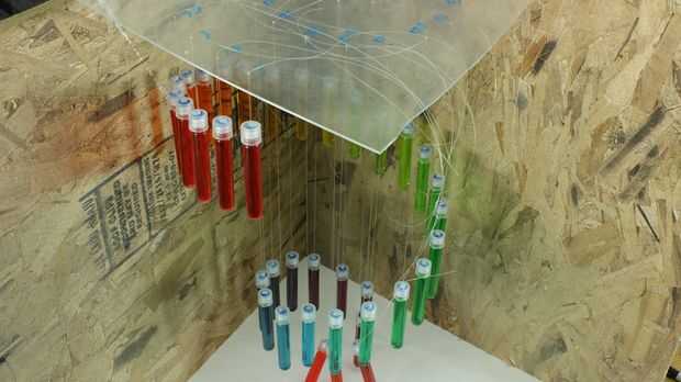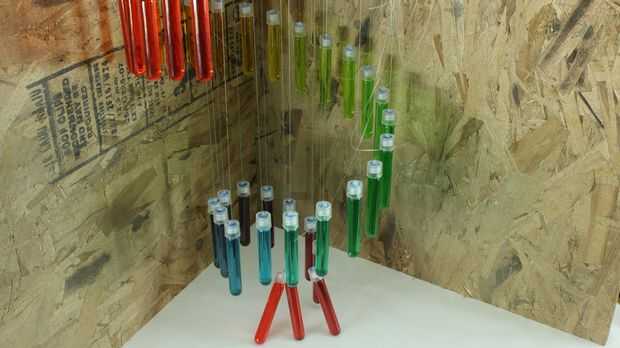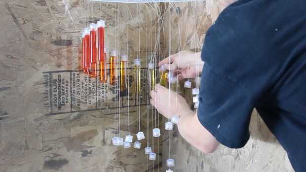 Para colgar los tubos de ensayo, apuntalado la lámina de plástico en dos piezas de tablero de OSB. Esto dejó todas las líneas de colgar en el lugar apropiado como está sujetando los tubos de ensayo.