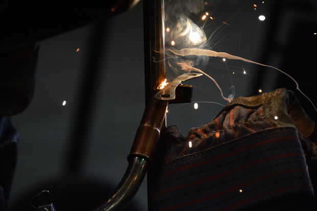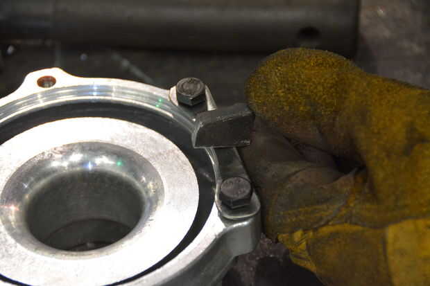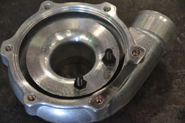 Para el montaje de la tapa de compresor usas originales tornillos y abrazadera que viene con el turbo. Haz un pequeño trozo de metal no importa el tamaño o la forma sólo tiene que actuar como una pestaña de la abrazadera para sentarse. Soldar la ficha a la pinza y luego soldarlo en la marca de 8 pulgadas en el tubo de acero de 1 pie.