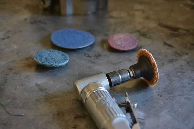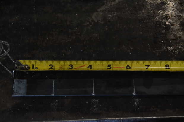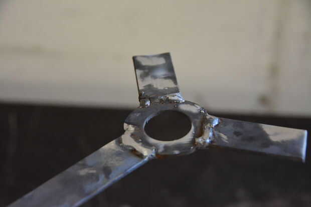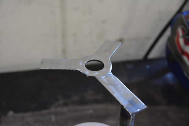 Vas a querer cortar tres 2 pulgadas barra plana piezas de acero y soldar a la lavadora de 3 pulgadas y luego soldarlo a la parte superior del tubo de acero para que cuelgue sobre la base.