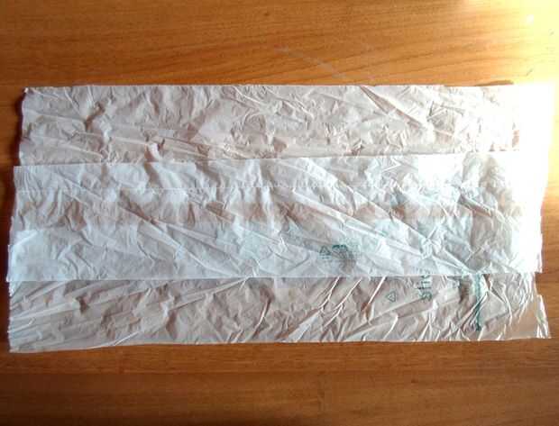 Cortar tiras de 10x44cm (17.32 x 3.93 pulgadas) de la bolsa. No te preocupes el lado más largo, puede ser un poco más pequeño o más grande de 44cm, el resultado será perfecto de todos modos.