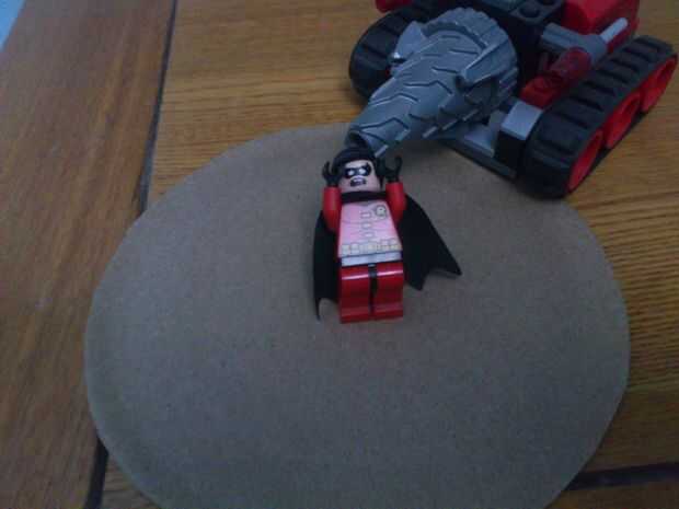 Que cortar un círculo de cartón y llevó una minifigura de Lego (Robin lo siento: P) y lo pegan en la cartulina.
