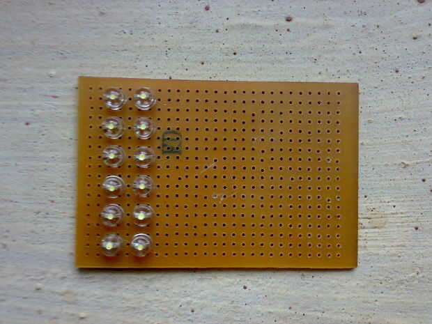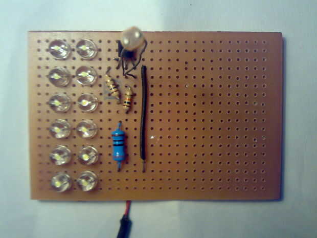 complete el circuito según el diagrama del circuito, conectar los LEDs en paralelo (puede agregar más llevado si es necesario) también ver fr la polaridad del led antes de colocar en el tablero porque volver a soldar hace el circuito sucio