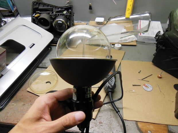Durante el corte del agujero que periódicamente probar montar mi bombilla. Todo lo que se necesita para unirla era tornillo de conexión de la lámpara en la lámpara con la lámpara de sombra entre los dos. Aquí es el primer éxito, por suerte era un ajuste perfecto. Parecía agradable e incluso a mí. Si usted piensa que parece torcido por favor no me diga o me moleste para siempre.