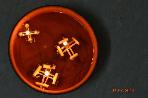 Tomar un recipiente lleno de agua hasta la mitad de su borde, añada aceite a él (cualquier quema aceite, oliva, mostaza, etc.) para que la capa de petróleo es alrededor de 1cm de espesor.