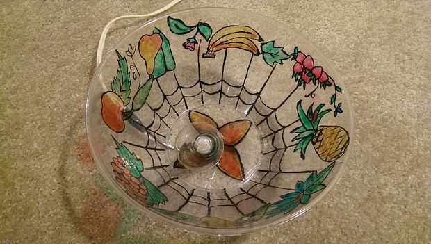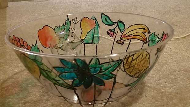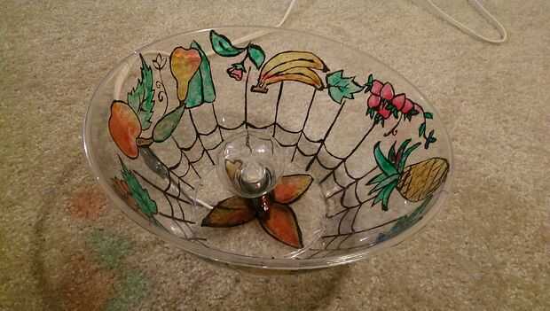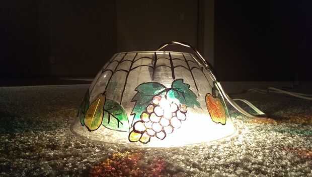 Otra vez tienes un bol de palomitas de maíz de Dollar Tree y pintado una lámpara de Tiffany como patrón con colores de cristal. Entonces usando un pincho caliente perforado un agujero en el fondo de la olla para pasar el cable de la lámpara.