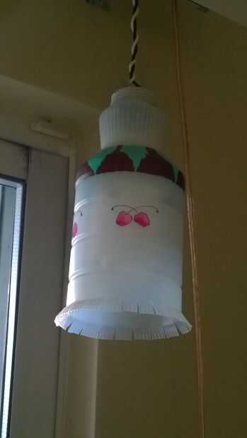 Se trata de una botella de jugo reciclado. Esto fue obra de 15 minutos. Corte solo la parte inferior de la botella de jugo y esposa pintado patrones con colores acrílicos. Tiene un CFL para encenderla.