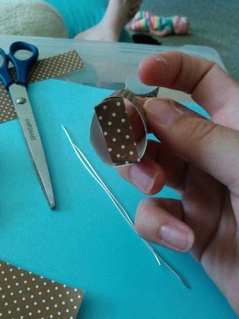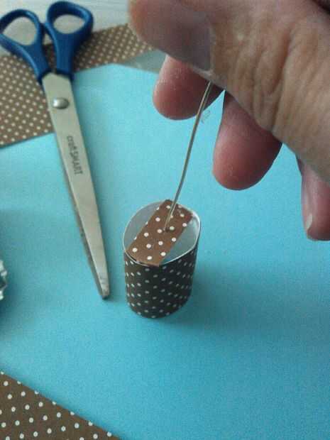 Pone una gota de pegamento adhesivo en los extremos doblados dentro del papel. Fije las partes pegadas a la sombra. Deje que el pegamento luego mediante su cable haga un orificio a través del papel. Fijar el papel en el otro extremo de la sombra y repita el paso anterior. Consejo: Si no entra facilidad, suavemente retorcer el cable, asegúrese de que usted sostenga la lengüeta de papel enseñado.
