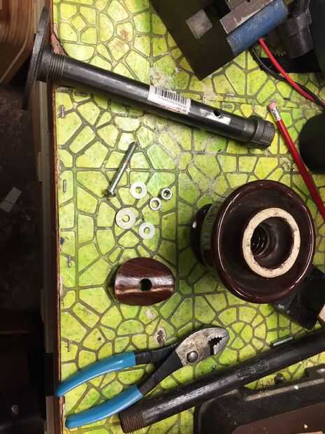 También tengo un par de tonos de huracán 2 dólares en la venta de granero. Un agujero simple a través de un tubo y un tornillo de carrocería esta había hecha la lámpara más fácil todavía... Usé una arandela de vinilo para evitar romper el aislador cuando aprieta el tornillo. Sólo un pedazo de tablón de vinilo sobrante moldura cortada con una sierra.