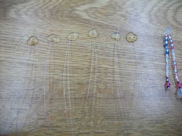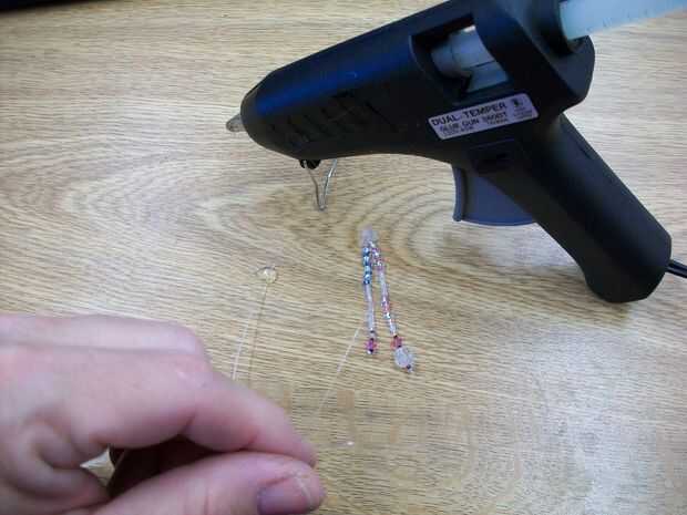 2. usando la pistola encoladora y lineas de pesca hacen un filamento doble más largo que la longitud deseada, con una bola de pegamento que mantiene juntos los dos filamentos. Corte un pedazo largo y unir los extremos formando un bucle. Hacer una cadena de 24" largo cuando se coloca da le dos filamentos en 12"... más fácil de trabajar con abalorios. Sólo se cuentas la longitud deseada para los hilos que está haciendo. Dejar caer una cucharada de pegamento caliente en la superficie de trabajo y empuje los extremos de la hebra en el pegamento caliente. Meneo y luego mantener en su lugar hasta que esté lo suficientemente frío como para sostener los hilos. Hago bastantes gotas y líneas para todos de un largo y hacer ese lote. Una vez acabado que hago más gotas y filamentos. Ver fotos por debajo de este paso.