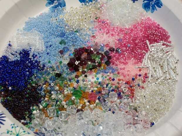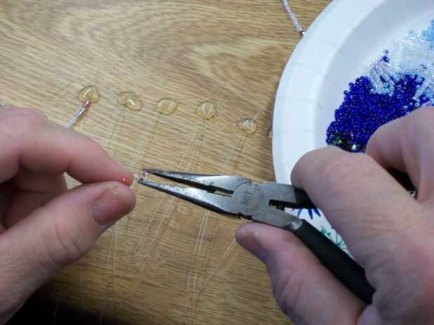 3. Cargue las cuerdas con los granos de la opción. Utilizar granos de la semilla, granos de cristal, granos de swavorski y variados encantos. Las posibilidades son infinitas. He encontrado usando los alicates de punta para sostener el grano y la carga en la cadena funciona más fácil. Ver fotos de abajo de este paso.