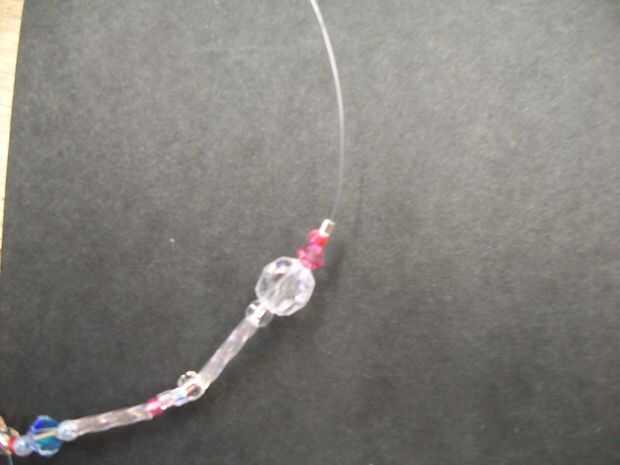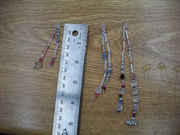 3. como dije antes... Usted tendrá 3 diferentes longitudes de hilos de abalorios. Tienes 2 cadenas por cada gota de pegamento... hacer una cadena de. 5" más largo que el otro, agrega al efecto. Vea la foto. corto 8, media 6 y 4 grupos de cadena larga.