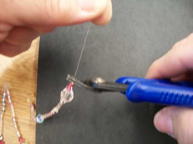 2. una vez el nudo apretado que puede Agregar una gota de presión hasta el final para asegurarse de que los granos permanezcan puestos. Deslice la tira metálica en cadena, luego utilice los alicates que prensan especiales para apretar en secuencia. Luego corte el cable restante de la pesca. Vea la foto.