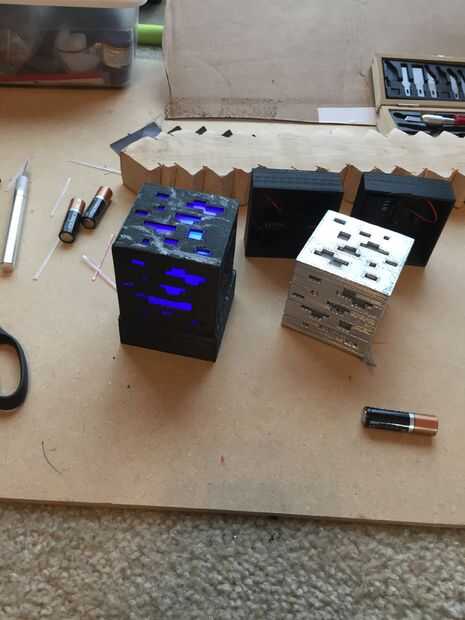 Pintura acabada píxeles de fuera del cubo de acrílico.Paso 1:Prueba de iluminación de LED's con fuente de alimentación de 12 voltios.Paso 2:acabado prototipo de trabajo para todos los fanáticos de Minecraft.