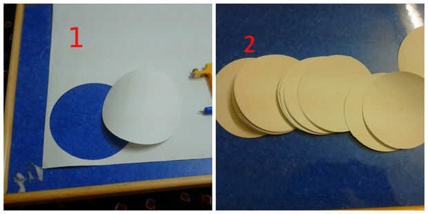 - Dibujar varios círculos en papel utilizando la brújula, el centro del círculo es importante ubicar. Yo dibuje círculos con radio de 5,5 cm. cuanto mayor sea el radio, mayor será la forma.
