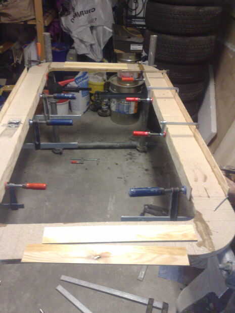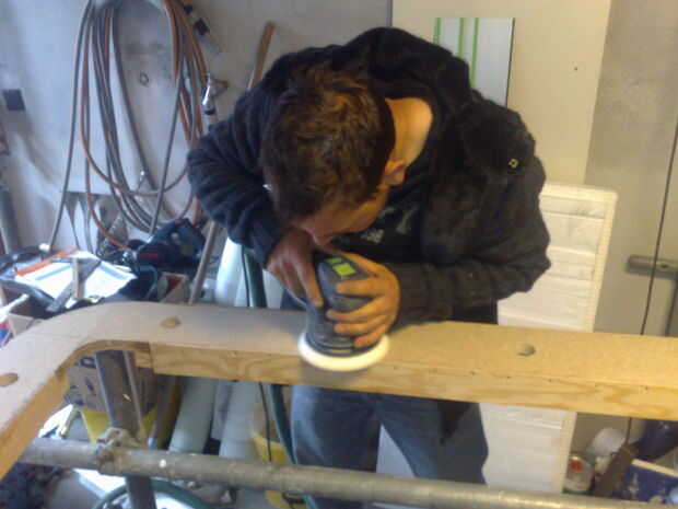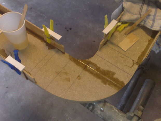 Actitudes haben wir Pressspanplatten zurechtgesägt, 2 geklebt de 9mm-Platten jeweil versetzt aufeinander, sé keine durchgängigen Stöße entstehen. Dann un den Seiten schmale Sperrholzbrettechen aufgeklebt und das ganze grob verschliffen. Dann gespachtelt und nochmal mit 500er Sandpapier verschliffen.