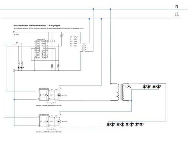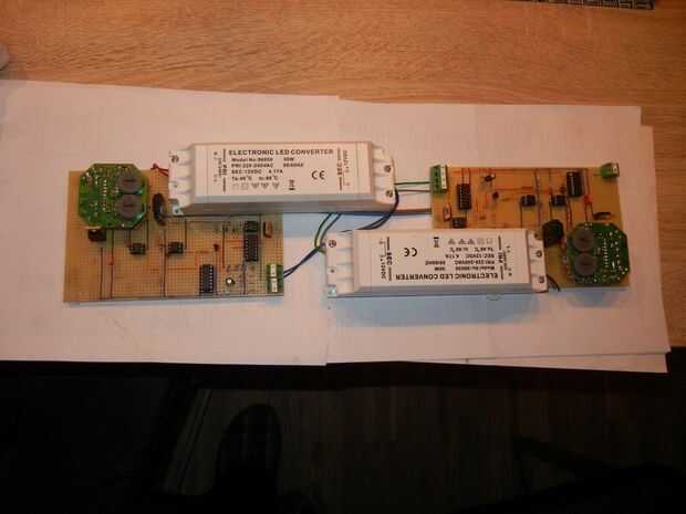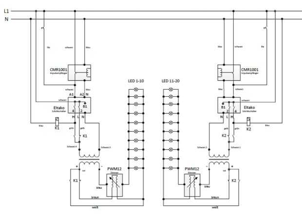 Der erste Schaltplan incluye den Aufbau mit Elektroinstallationskomponenten estándar. LED da aber bei Dimmung zum Pfeifen neigen, haben wir entschieden, einen Aufbau mit kleinen Schaltkreisen zu wagen. Der rechte Plan incluye das Prinzip. Das funciona gut.
